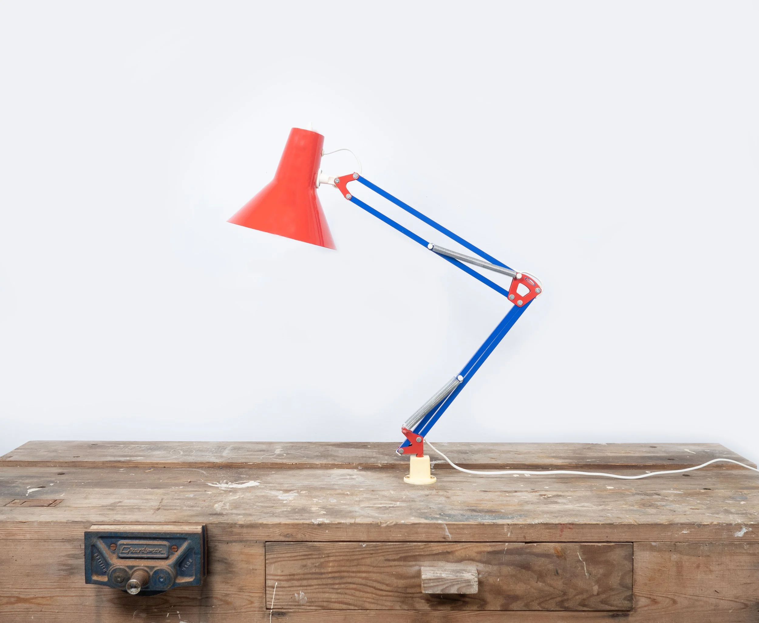 An Anglepoise style lamp, produced in the 1980s by Flexa. Features a blue and red painted colour block design and can be adjusted into various positions. It mounts to a flat or horizontal surface using a plastic holder (see pictures). It has the original wiring which is in good condition and it has been PAT tested.